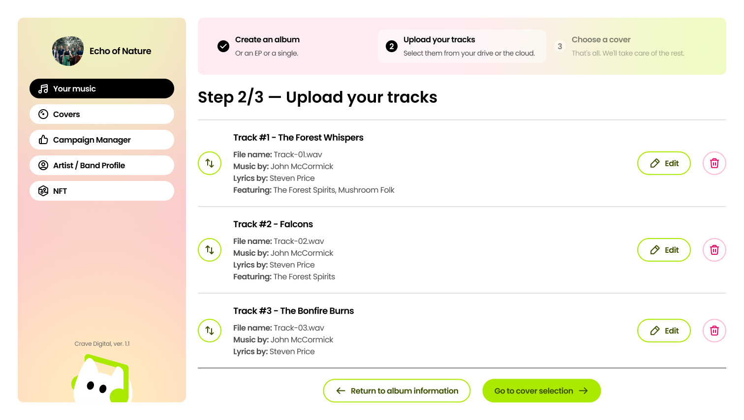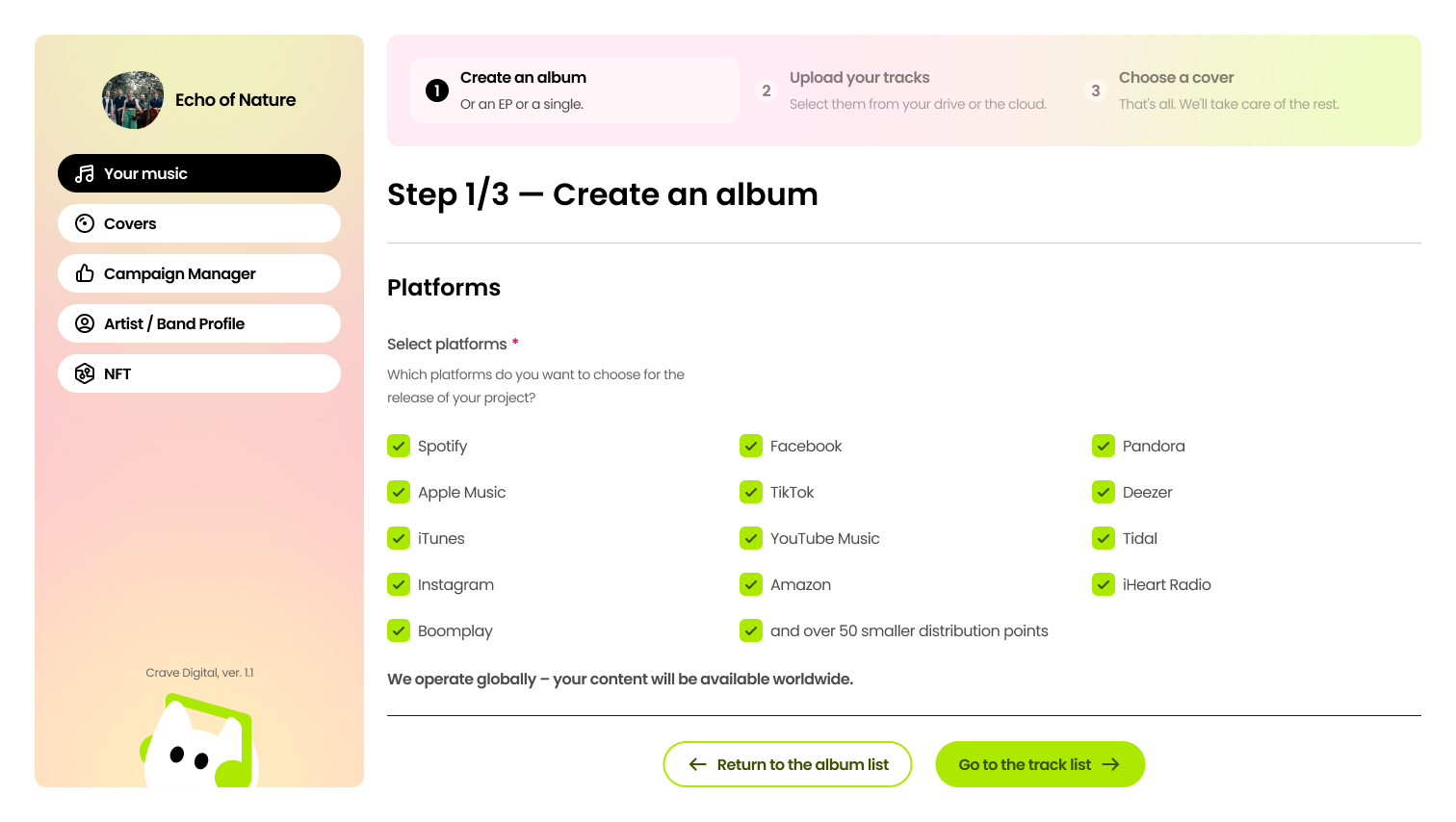 When your release date arrives and your music becomes available, you’ll start earning every time it’s streamed or downloaded. You’ll have access to detailed statistics and sales reports, and you can withdraw your earnings directly from your Crave account.
