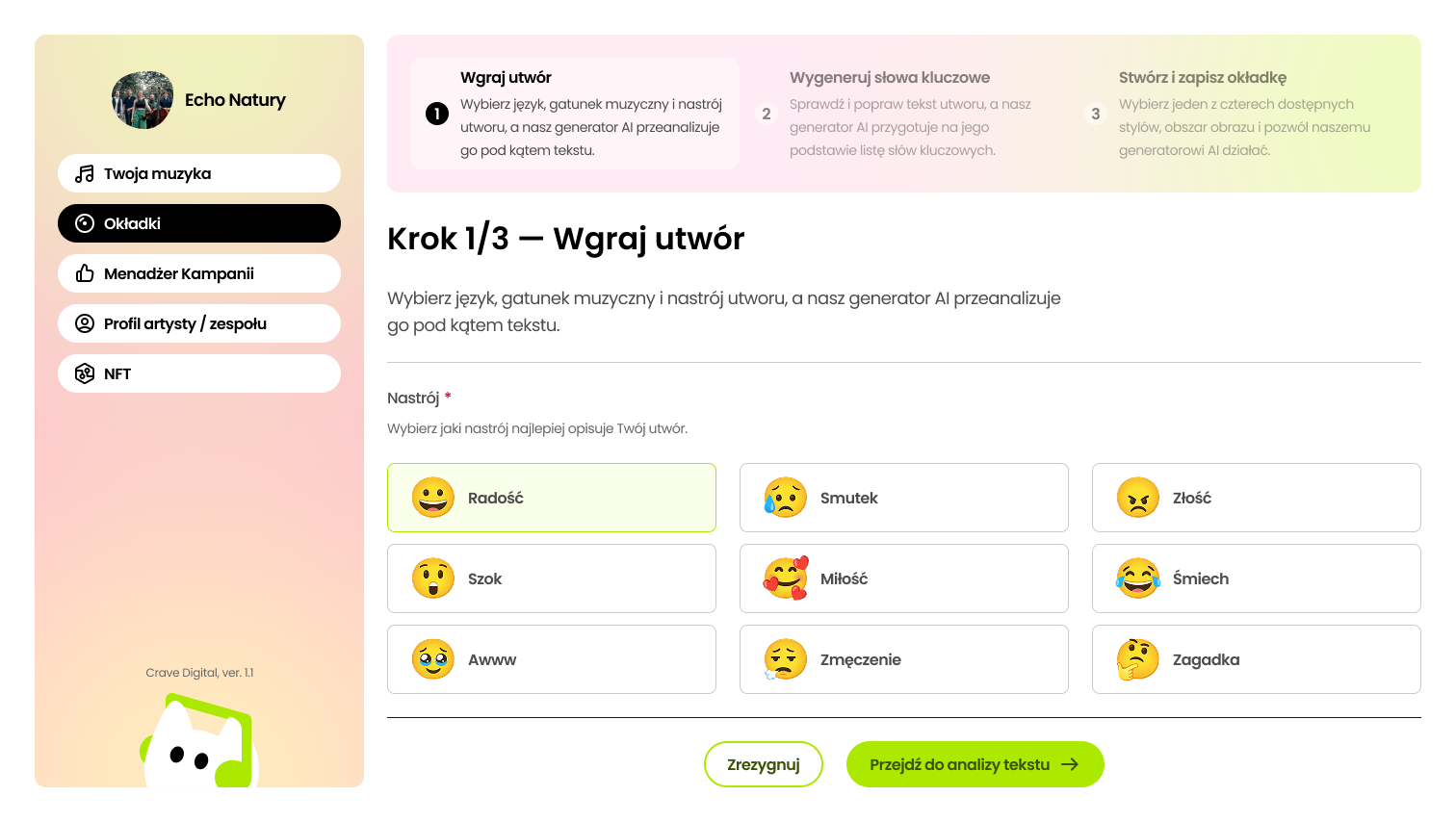 Dodaj swój plik audio - Kreator automatycznie rozpozna tekst, tempo, nastrój i styl Twojej muzyki.